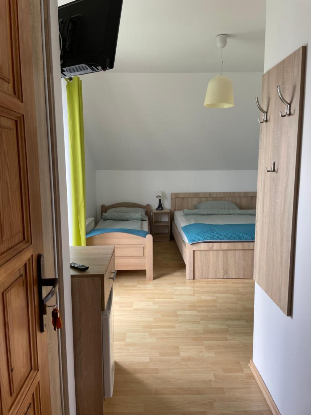 Pokój trzyosobowy z balkonem. This triple room features a private bathroom, a dining area, a wardrobe as well as a balcony. The unit offers 2 beds. Pokój Trzyosobowy - 3 osobowy. ;